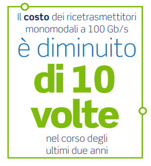 Poiché il mercato si sposta verso i 200 e i 400 Gb/s, crescerà l’adozione del cablaggio in fibra monomodale. Infatti la recente adozione da parte dei data center iperscalabili ha determinato una riduzione del costo della fibra ottica monomodale tale per cui il costo per i ricetrasmettitori monomodali da 100 Gb/s è diminuito di dieci volte nel corso degli ultimi due anni, avvicinandosi a quello della fibra multimodale. Anche se i data center migrano verso velocità più elevate, in alcune aree l’infrastruttura di cablaggio in fibra esistente, ad esempio OM3 o OM4, in futuro sarà in grado di supportare molte applicazioni.