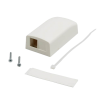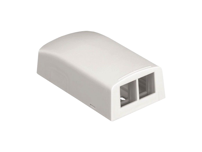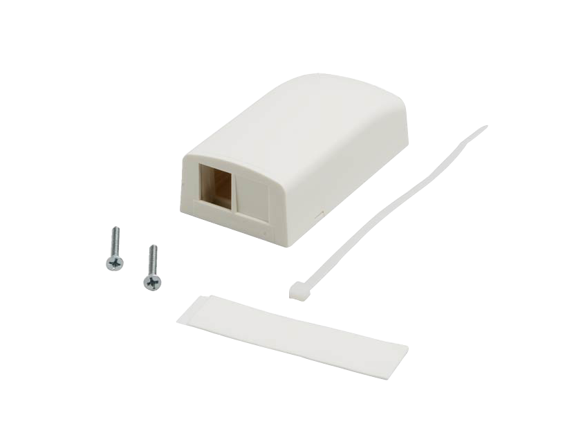 La scatola NetKey a 2 posizioni accetta tutti i moduli NetKey per fibra e rame e le applicazioni audio/video. La scatola può essere montata con viti, adesivi o calamite e fascette opzionali. Possono essere applicati passacavi per ordinare i cavi in entrata.